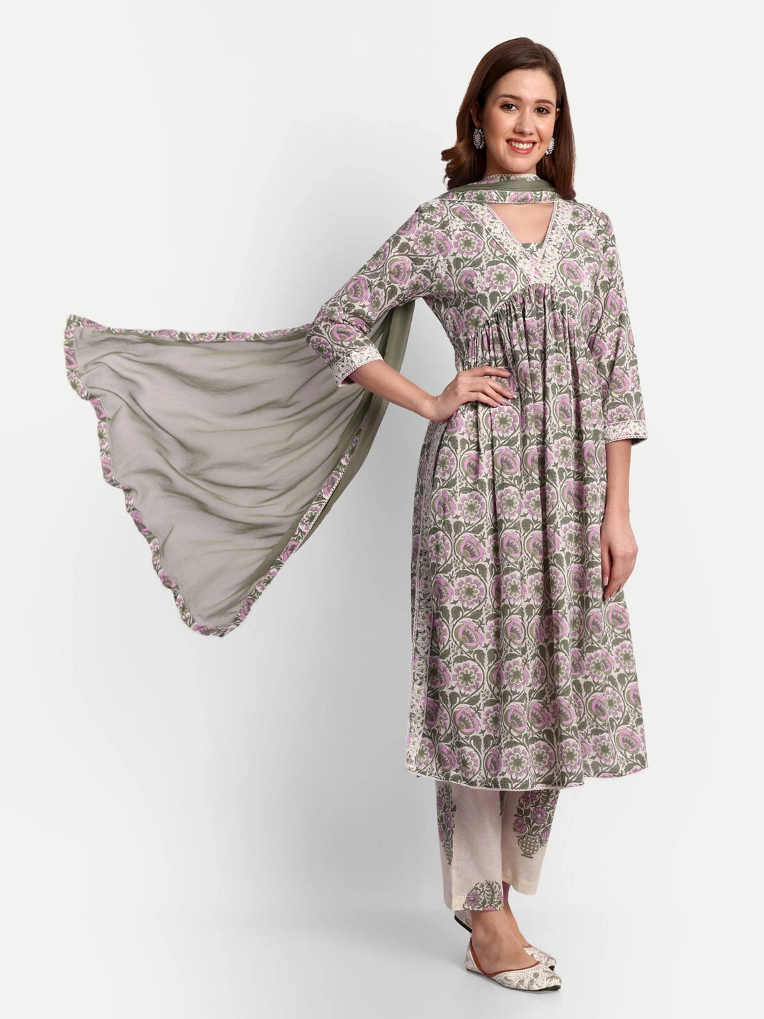 Floral Printed Cotton Kurti Set With Trousers & Dupatta