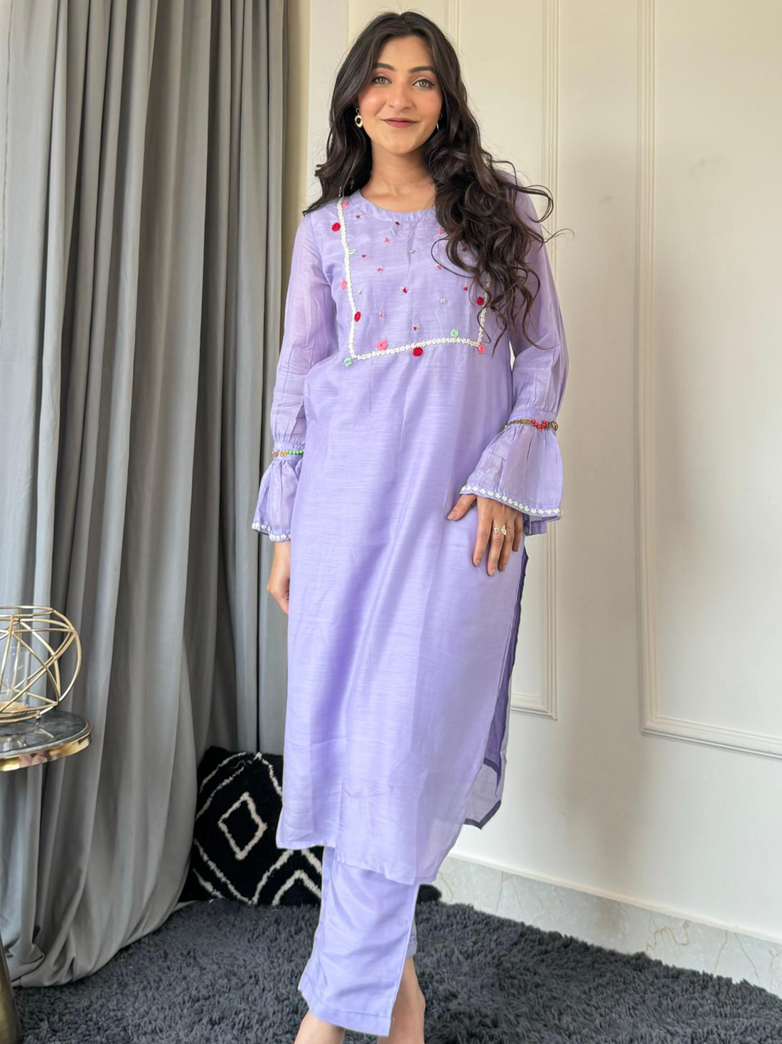 Elegant Purple Kurta with Embroidered Handwork and Matching Pants