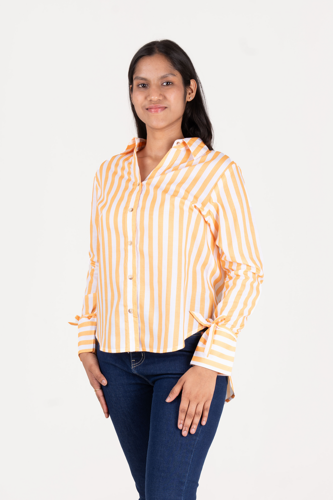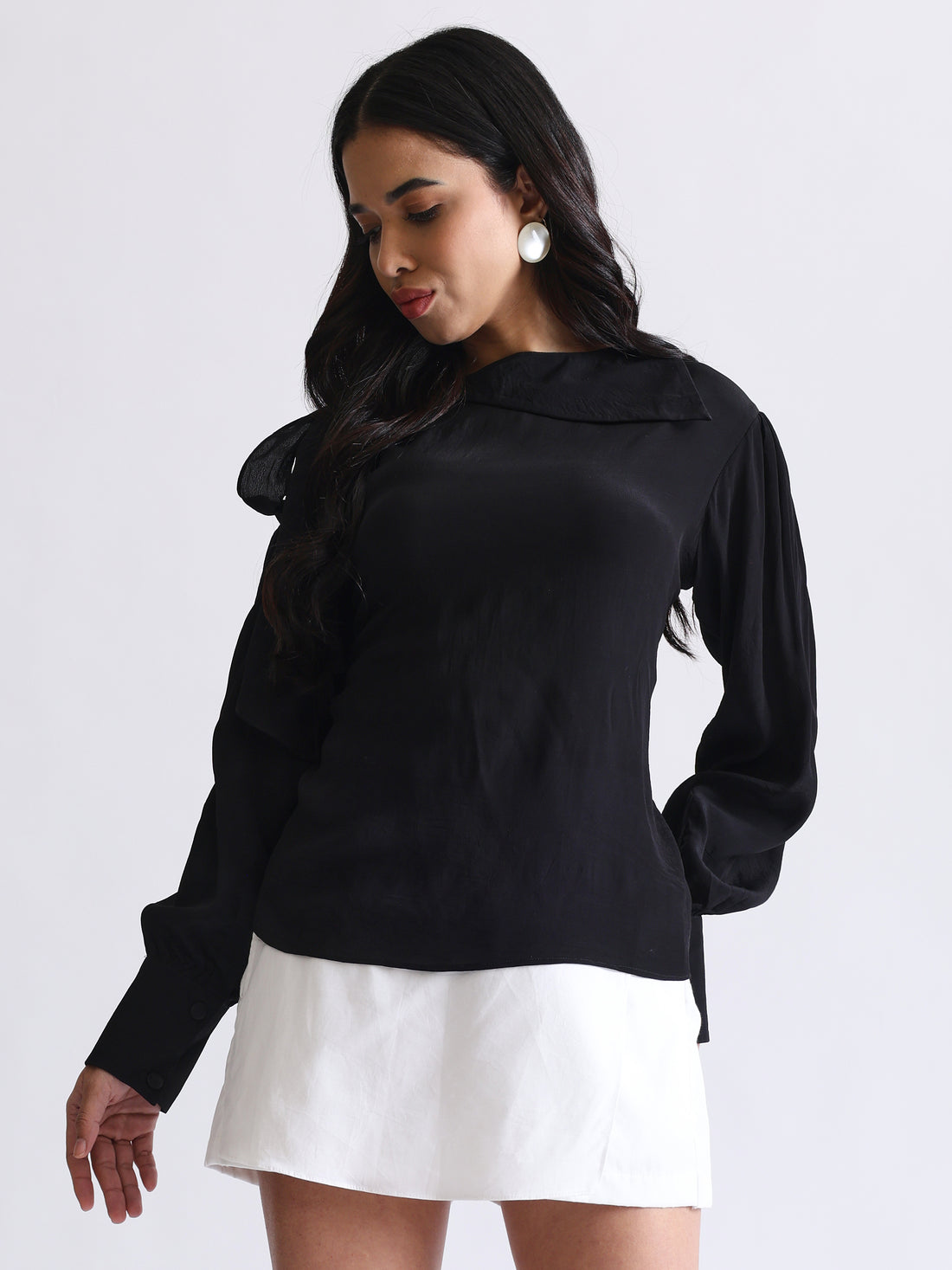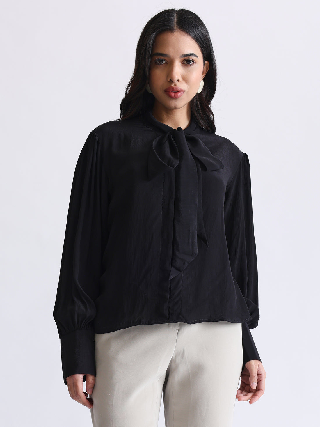 Shirt with Satin Tie-up Neck and Cuffed Sleeves