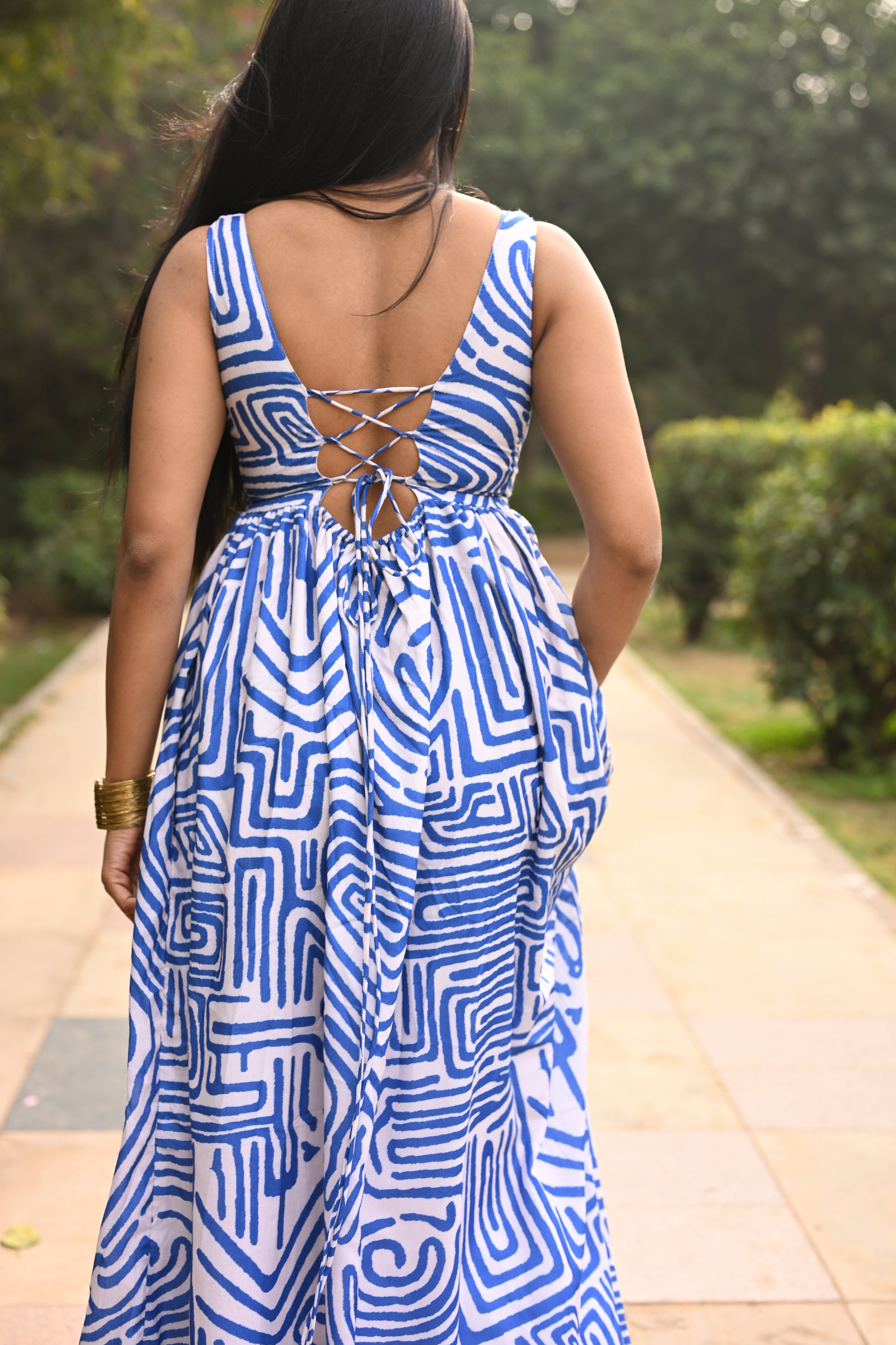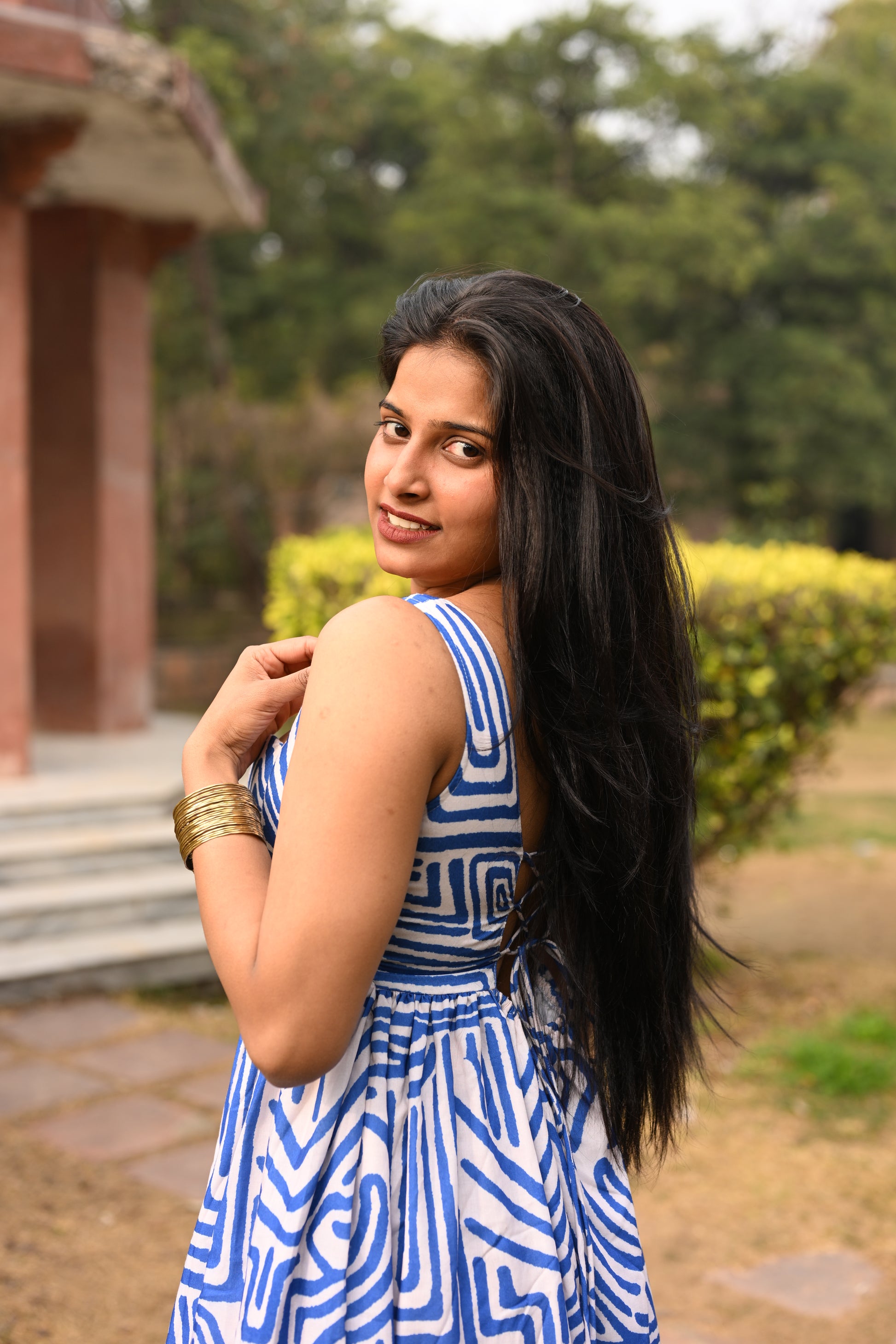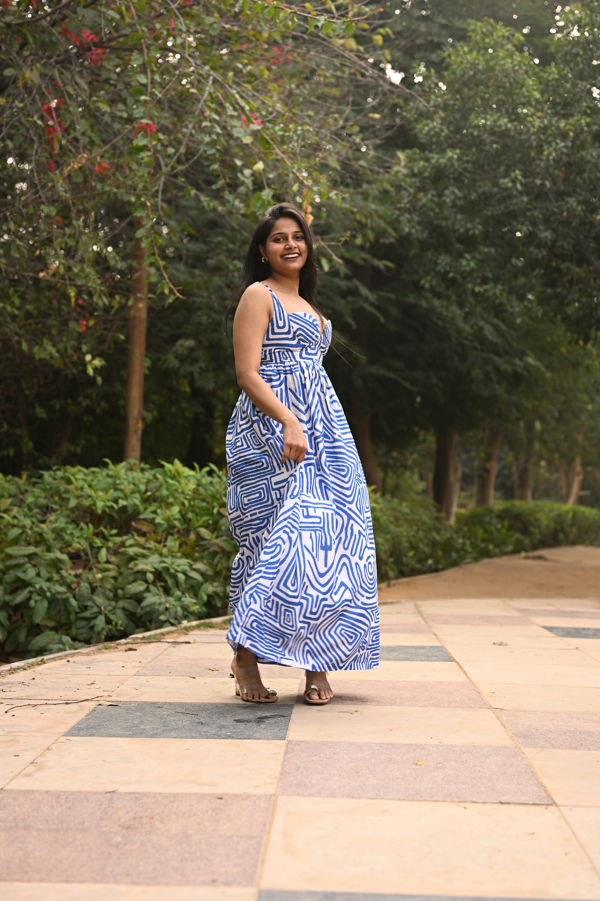 Make a statement in this printed blue padded dress designed for comfort and shape. Featuring a flattering sweetheart neckline with built-in padding for confident support, this dress comes with a soft inner lining for a smooth, non-see-through finish. The striking abstract/maze print adds a bold, modern vibe—perfect for brunch, vacations, day outings, and casual parties.